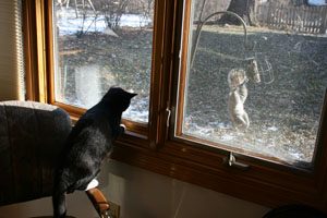 Oreo watching our athletic squirrel at the bird feeder |